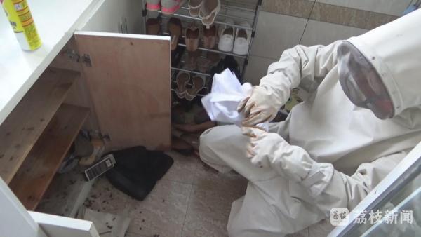 消防救援人员到达现场,发现一堆马蜂在鞋柜里面,随后,消防救援人员穿上防蜂服做好安全防护后利用杀虫剂对其进行处置,其余消防员做好现场警戒。