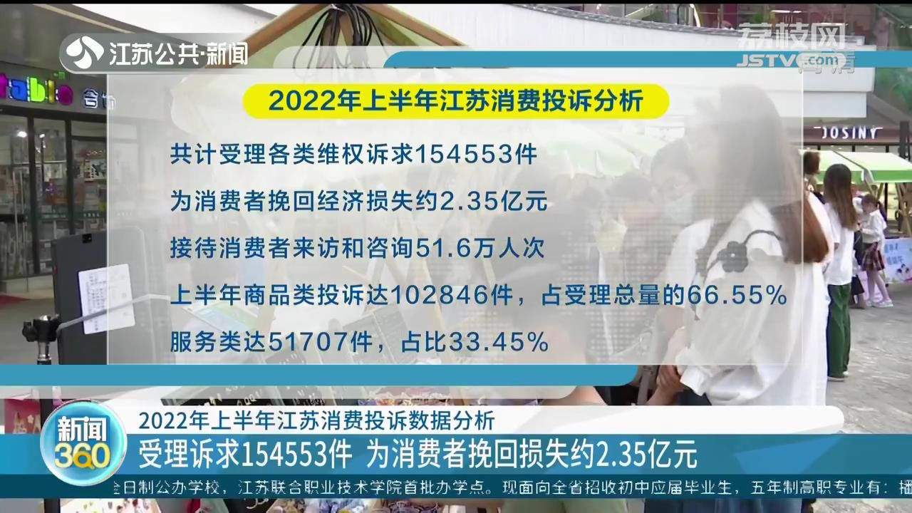 2022年上半年江苏全省消保委系统共计受理各类维权诉求154553件,为消费者挽回经济损失约2.35亿元,接待消费者来访和咨询51.6万人次,从消费类型来看,上半年商品类投诉达102846件,占受理总量的66.55%;服务类达51707件,占比33.45%。
