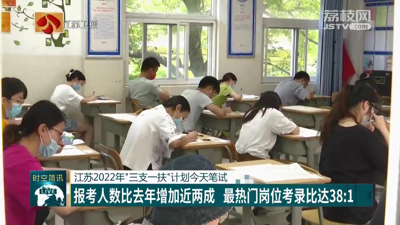 7月3日,江苏省2022年高校毕业生“三支一扶”计划笔试在南京、徐州、南通等九市同时开考。今年,江苏计划招募400名高校毕业生到苏中、苏北八市从事两年的支教、支农、支医和帮扶乡村振兴等工作,共吸引了9877名高校毕业生网上报名,最终审核确认的有7592人,比去年增长19.1%,考生中本科及以上学历达98.3%。今年帮扶乡村振兴岗位由于专业限制少,报考人数最多,竞争最为激烈,平均考录比达38:1。3日的笔试主要侧重考察考生的思想政治素质、到农村基层服务志向以及解决实际问题的能力等。7月下旬将根据笔试成绩组织面试、考察、体检等工作。