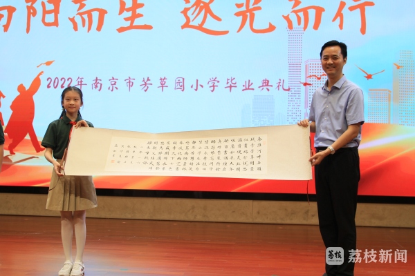 毕业生代表王泽瑞、余蕴如则向学校送上两幅书法作品,“在这幅作品里,既有我们芳草园小学的校训和办学理念,也有我们的特色活动六年百书和能豆豆讲坛,还有咱们高校长的名号。我们特别想把属于学校的一切美好都表达出来,更希望当我们回到母校时,已是功成名就,文经武纬,归来母校夸!”
