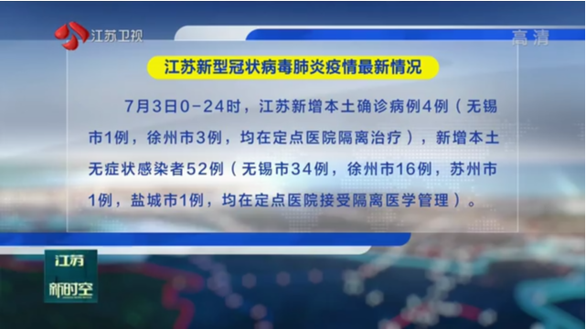 7月3日0-24时,江苏新增本土确诊病例4例(无锡市1例,徐州市3例,均在定点医院隔离治疗),新增本土无症状感染者52例(无锡市34例,徐州市16例,苏州市1例,盐城市1例,均在定点医院接受隔离医学管理)。