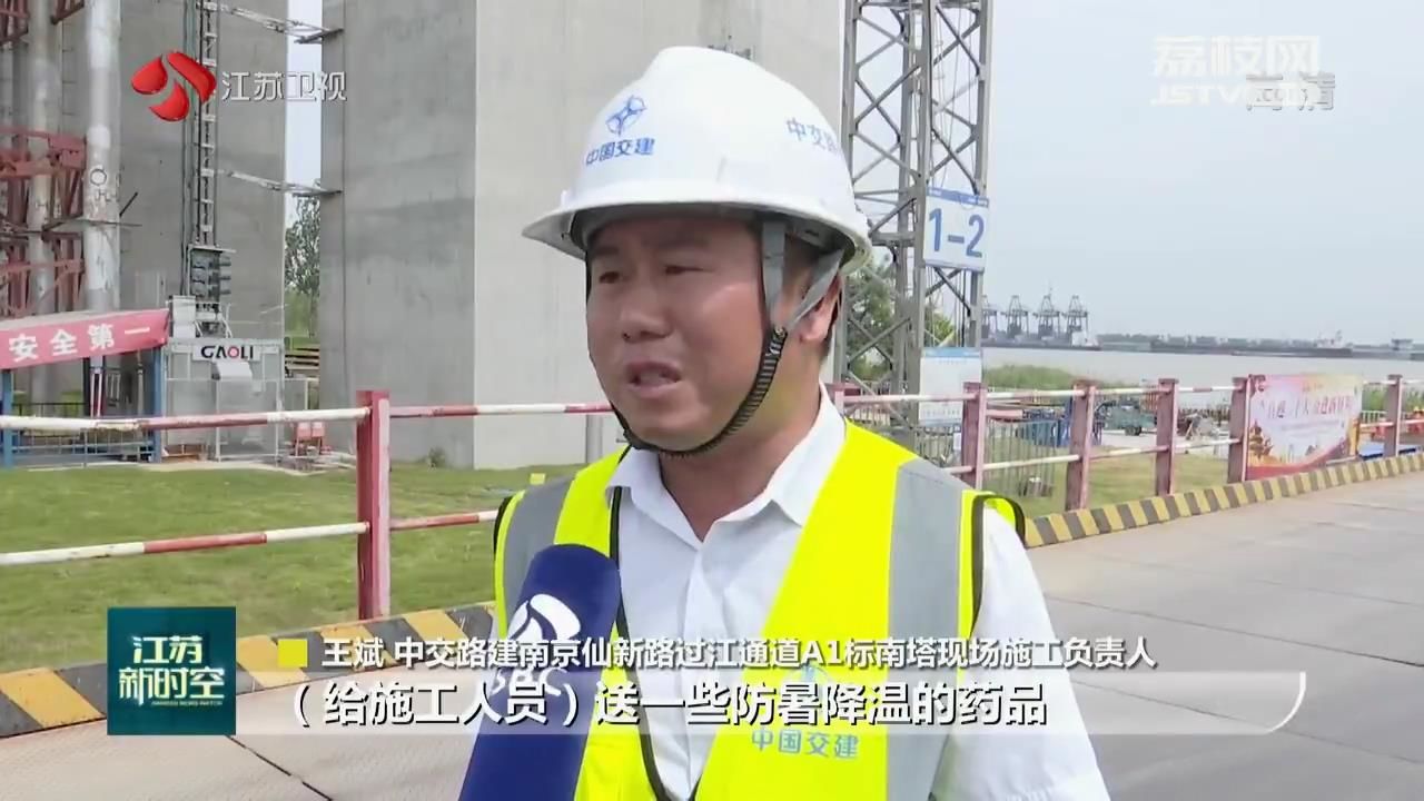 中交路建南京仙新路过江通道A1标南塔现场施工负责人王斌说:“我们现场设置了一个休息室,里面备了凉茶,给施工人员送一些防暑降温的药品。”