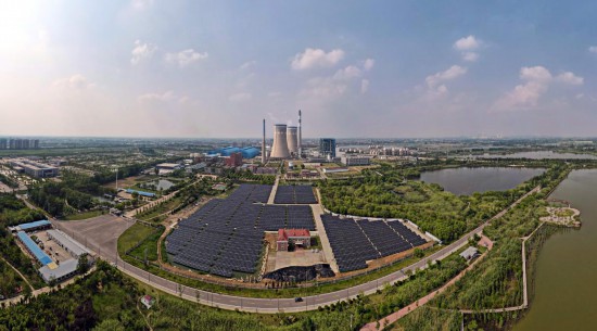 盛夏时节,九里湖西北侧,华美热电有限公司内,一片片排列整齐的光伏板熠熠生辉。光伏板下,成片的花生、苜蓿绿油油地生长,鱼塘里睡莲在开放,鱼儿在嬉戏。道路两侧的路灯上,每一盏都安装了蓝色光伏板和白色风机。