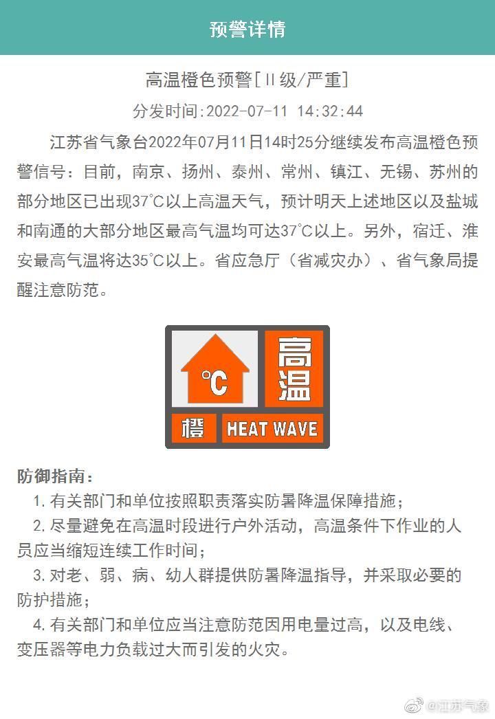 我苏网讯 据江苏气象消息,今天(7月11日)江苏淮河以南地区出梅!暑热袭来,这几日,江苏多地都已迎来35℃+的高温天气,江苏正持续经受暑热和雨水的双重考验。今天,江苏省气象台继续发布高温橙色预警信号,未来一周江苏依然“热力不减”,最高气温或达39℃。