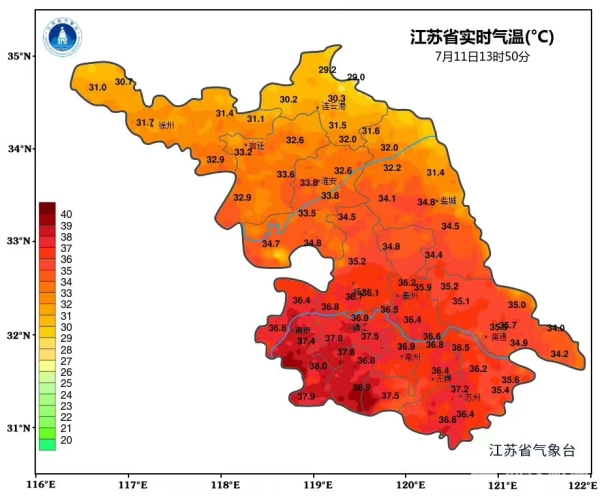 近期,随着副热带高压北抬西伸,高温牢牢锁定在长江中下游地区。特别是明后天,高温范围扩大,强度增强。7月12到13日,沿江苏南的最高气温可达36℃到38℃,局地39℃。14日到18日,我省的高温的强度和范围都将有所减小,到沿江苏南地区,最高气温在35℃到37℃,19日之后 高温天气结束。