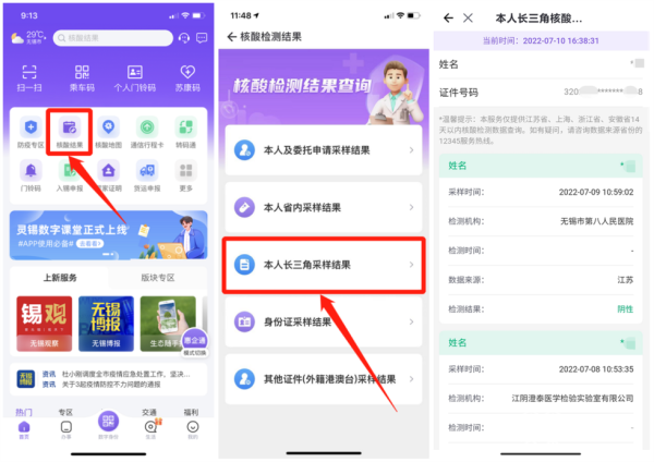 据我苏网 为方便长三角各城市人员往来无锡,7月11日,记者从无锡市大数据管理局获悉,“灵锡”APP于今天正式上线长三角区域核酸检测结果查询功能,实名用户可查询本人江苏省、上海市、浙江省、安徽省14天以内的结果,助力便民生、促流通、稳经济。详情>>