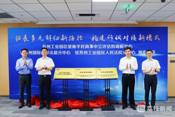 7月13日下午,苏州工业园区星衡平民商事中立评估和调解中心及驻苏州国际商事法庭分中心、驻苏州工业园区人民法院分中心揭牌活动在苏州国际商事法庭举行。