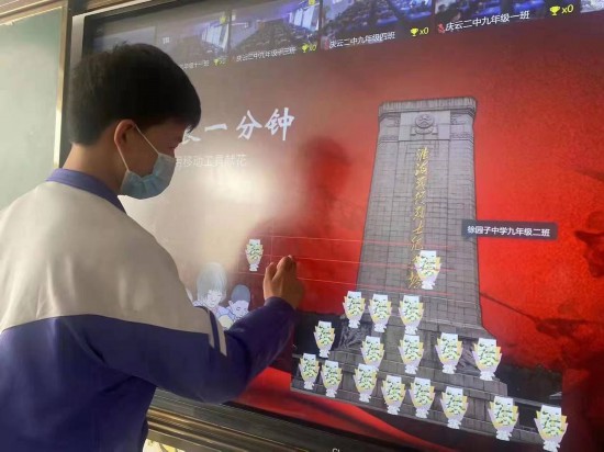 今年的4月5日清明节上午,一场“至今思英魂,清明祭烈士”的“云祭扫”淮海战役烈士纪念塔活动,在上海和江苏等3省4城37所中小学校开展。在庄严肃穆的气氛中,各地师生通过教室前智慧教学大屏,清晰地观看淮海战役纪念塔内的展品和照片,与不同地方的同学相互交流,最后集体起立,为烈士敬献“花篮”。当天参与学生共有1400人,直播链接观看人数近2万人。