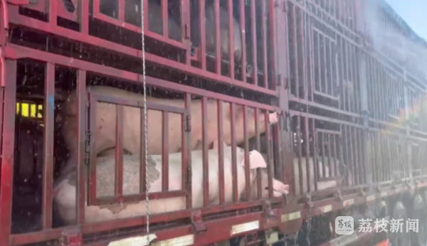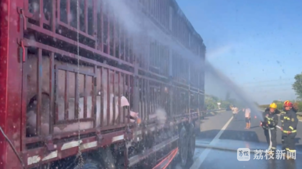 昨天(8月15日)下午3点半左右,淮安市G25长深高速由北向南方向,蒋庵服务区附近有一辆货车高速爆胎,车上的生猪急需降温。