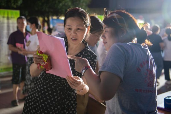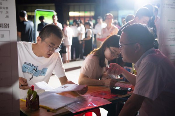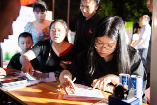 ↑8月18日,在宁乡市文体中心,求职者填写个人简历。
