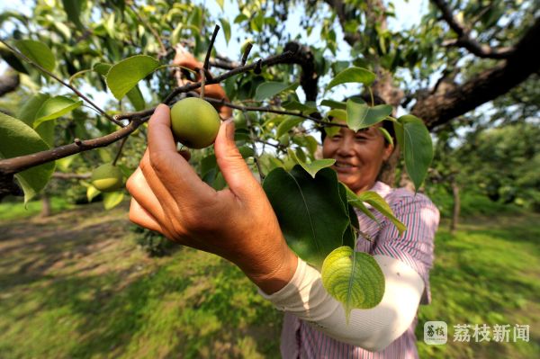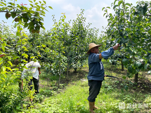 “你看我这里的梨子,今年长的可以,个头都很大,估计都能到六七两左右!”80岁的果农肖庆全正查看果实的生长情况,他咧开嘴开心地说道:“我这个品种是白酥梨,到八月底就能采摘了!”