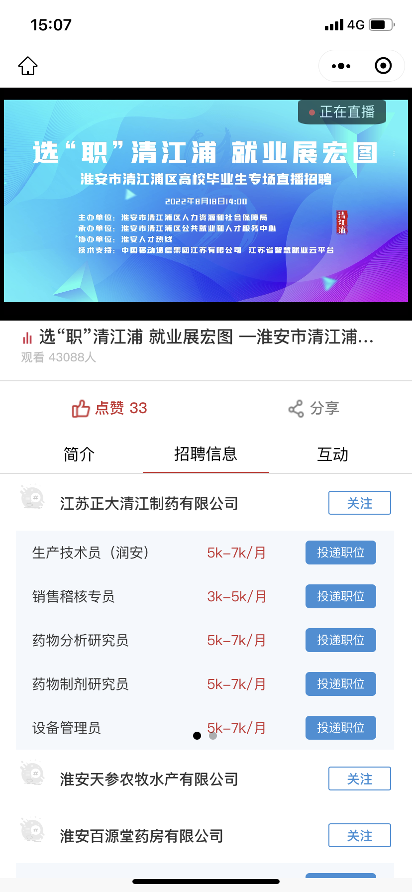 大家好,我今天带来的岗位有药物分析研究员、质量管理员(QA)、临床代表等,公司氛围融洽,福利待遇优厚……”直播间里,江苏正大清江制药、淮安天参农牧水产、淮安百源堂药房等5家企业人力资源代表与主持人通过诙谐有趣的语言介绍企业的文化、岗位信息、薪酬待遇等,吸引近5万人关注。