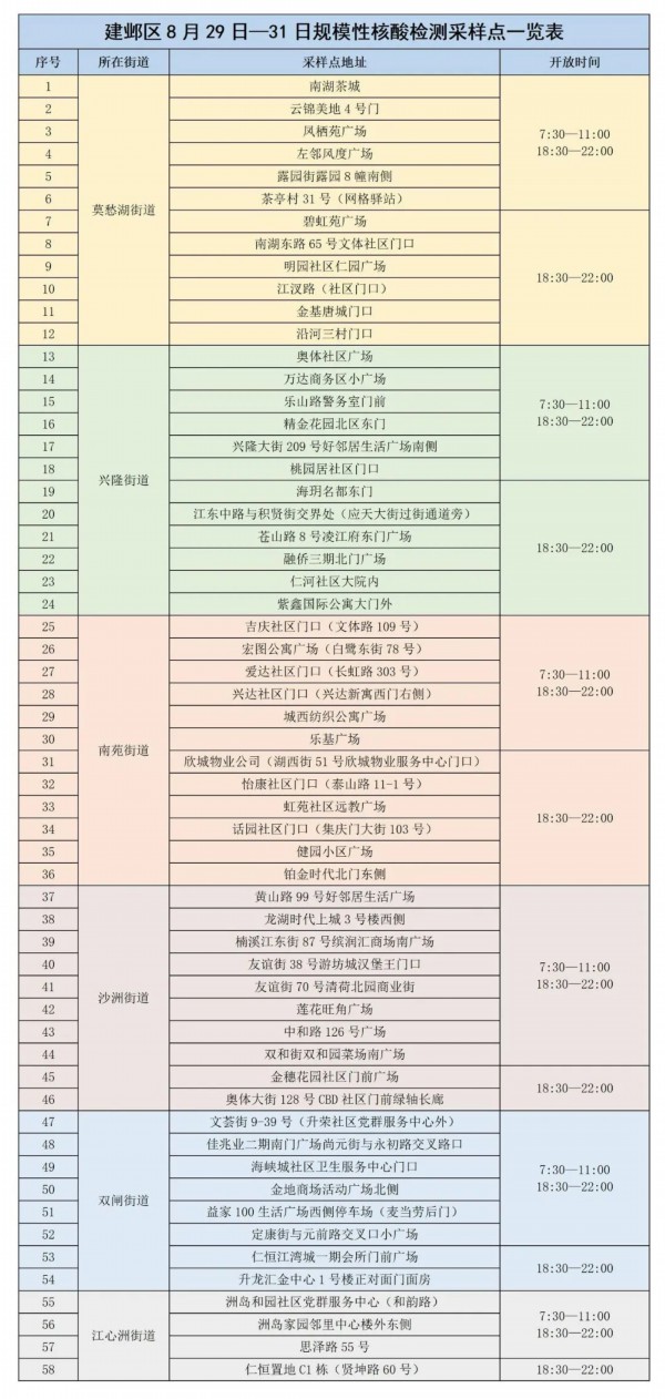 1.建邺区8月29日—31日规模性核酸检测采样点一览表