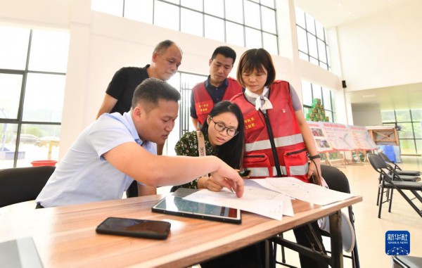 2022年5月6日,广西柳州市融安县大坡乡岗伟村驻村第一书记黄晨晖(后排右)和乡镇干部、工程设计人员在大坡飞鸡农特产品大数据中心讨论岗伟村产业示范带方案。新华社记者 黄孝邦 摄