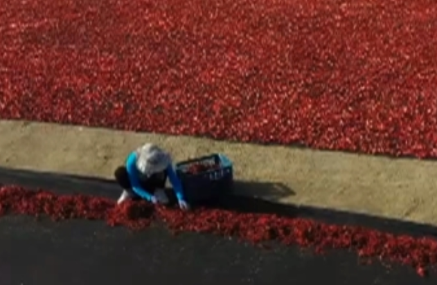眼下正是新疆辣椒丰收的时节,在新疆巴州博湖县,这两天,椒农们正抢抓晴好天气晾晒辣椒。大片大片火红的辣椒整齐地摊晒在戈壁滩上,宛如一块块红色拼图,与周围黄绿交织的田野嵌套在一起,在大地上绘出一片金秋的丰收盛景。据了解,新疆巴州部分地区光照时间长,昼夜温差大,金秋时节干燥少雨,非常适合种植和晾晒辣椒。这里种植的辣椒个大、肉厚,经过在戈壁滩上暴晒后,变成暗红的干辣椒,不仅可以作为餐桌上的食材,还可用来提取食用色素制作蛋糕、冰淇淋、口红等物品,十分畅销。今年,当地共种植辣椒47万亩,预计产量可达140万吨以上。