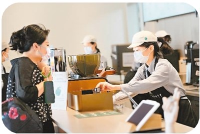 在星巴克西安翠华里手语店,语音识别系统、双面点单屏、手写板以及带编号的手持菜单等设施让点单交流不受语言局限。图为听障咖啡师李莎(右)为顾客制作咖啡。新华社记者 李一博摄