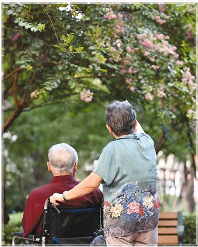 天津,一名老人推着残疾人丈夫赏花。新华社记者 李 然摄