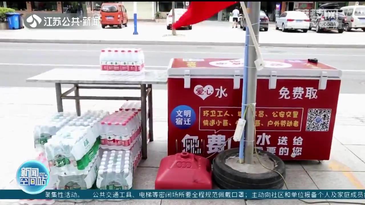 在宿迁市区微山湖路街边,一台红色的冰柜写着“免费爱心冰柜,随取随用”。在冰柜旁的桌子上,还有几箱常温的瓶装水,时不时有户外工作者停车取水。快递员周先生说,中午送快递的时候,天气比较热,就会取水喝,挺好挺方便的。
