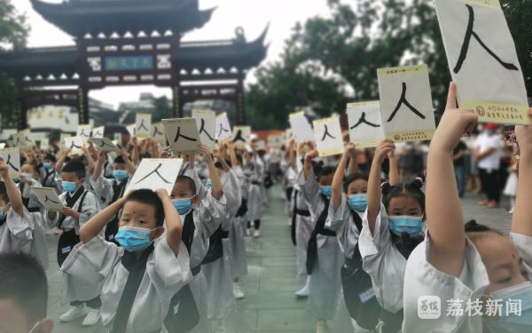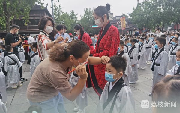 上午,南京市夫子庙小学为300多名一年级新生举行“开笔礼”仪式。一年级的萌娃们身着汉服,在“学长学姐”的带领下,齐声背诵《论语》片段。随后,在老师的指引下,同学们端端正正地向孔子像行三拜礼,立志要做一个懂礼仪、有志向的人。