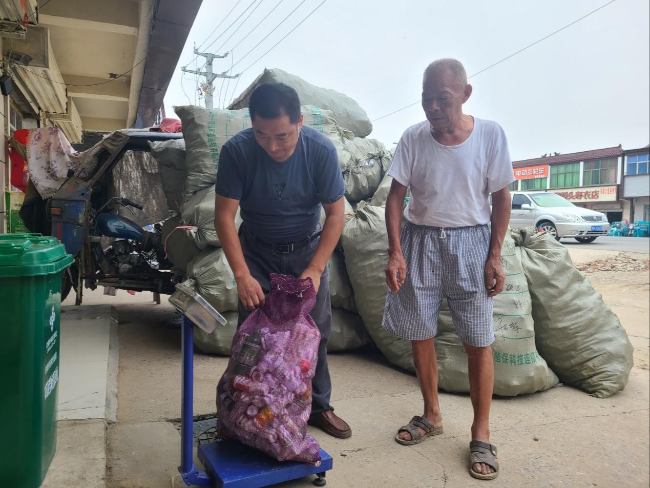 “五斤三两,一块五一斤,给你八块钱吧。”8月26日,在泗阳县三庄镇长辉农业籽种经营部,老板毕长辉说着就数出了八元钱给一旁的村民,然后将电子秤上的一兜子农药瓶倒进了专用回收箱。