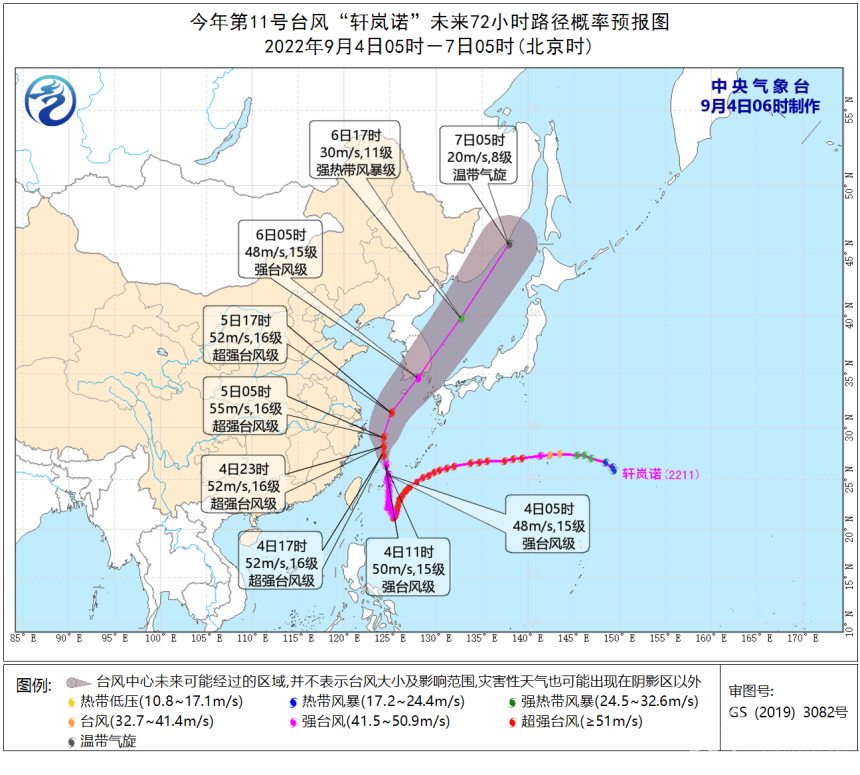 今年第11号台风“轩岚诺”(强台风级)的中心9月4日7时位于浙江省朱家尖岛南偏东方向约495公里的洋面上,中心附近最大风力15级(48米/秒)。预计,“轩岚诺”将以每小时15-20公里的速度向北偏西方向移动,强度将逐渐加强,最大强度可达超强台风级(16级,52-55米/秒)。