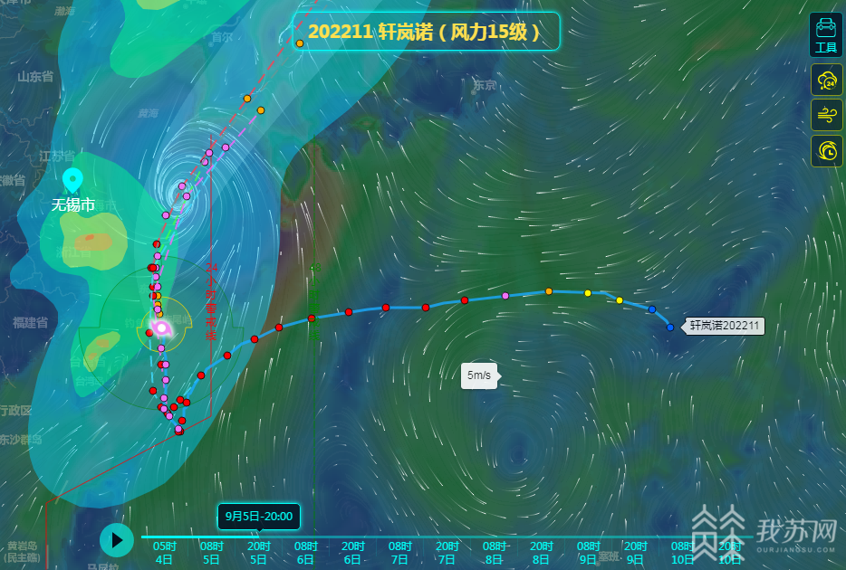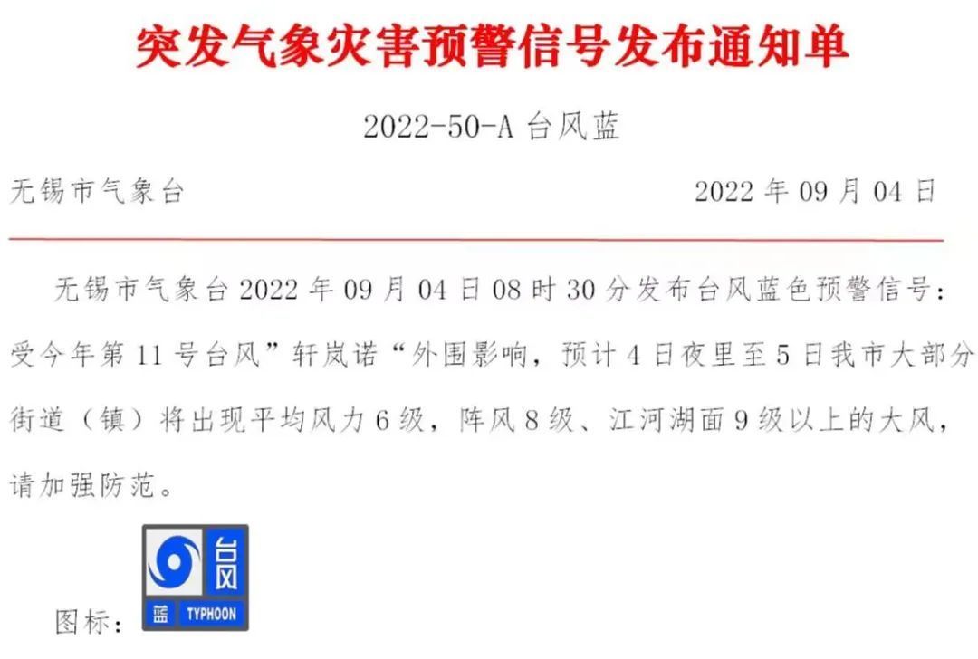 无锡市气象台2022年9月4日8时30分发布台风蓝色预警信号: