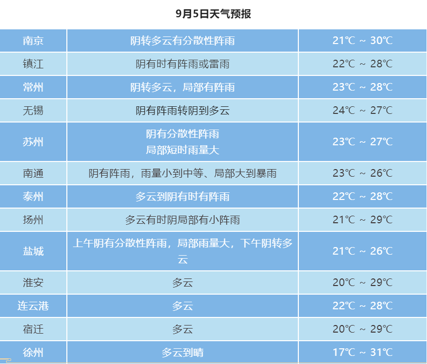 台风主要影响期间,江苏省除了东南部地区陆上有中雨、局部大到暴雨、南通海区有大到暴雨、局部大暴雨以外,其他地区基本以晴到多云天气为主。气象部门提醒,眼下正值夏秋转换时节,秋意渐浓,最高温度基本上是在30℃以下,在26-30℃之间,最低温度17-20℃之间,未来一周温度不高,早晚温差在10-13℃。在此提醒大家秋季气候多变,可遵循 “添衣物、多运动、勤开窗”的小妙招预防感冒。