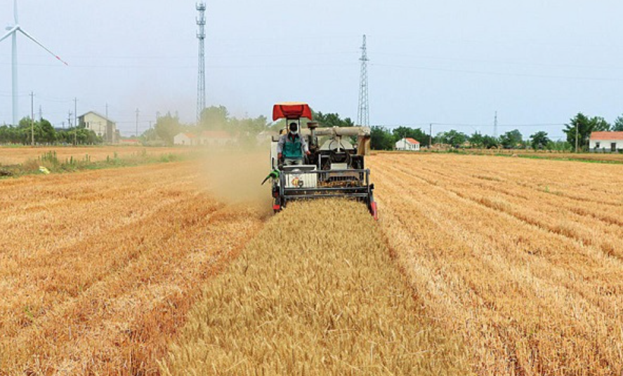 盐城市亭湖区黄尖镇,收割机在田间抢收小麦(2022年6月10日 赵久龙 摄)