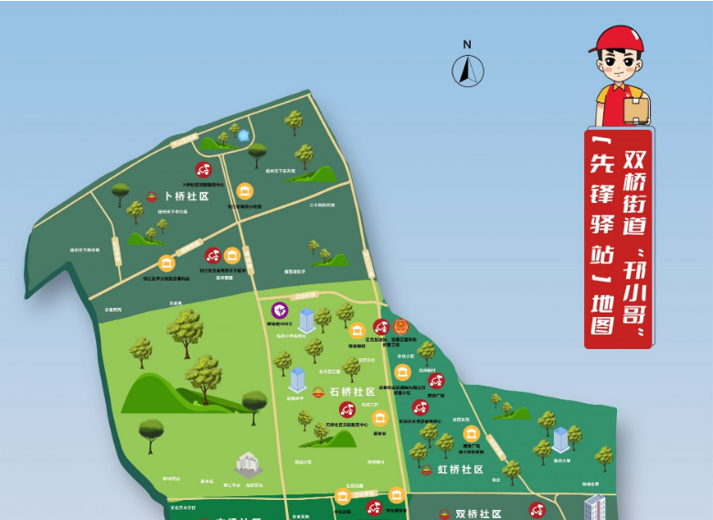 双桥街道位于城市主城区,辖区小区、办公楼栋多,商场、店铺林立,是外卖行业送餐的集中区域。为了给活动在辖区内的外卖小哥、快递小哥提供歇脚点,双桥街道在当天还发布了一张“邗小哥”先锋驿站地图,11个先锋驿站遍布在辖区内,每个社区都精心为“邗小哥”们提供了歇脚点和个性化服务。