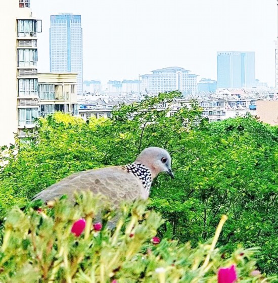 近期,罗先生频繁发现自家阳台花盆上多了许多细小的枯树枝。开始以为是大风刮来的,他就将枯树枝清理掉。直到有天,他发现一只衔着枯树枝的珠颈斑鸠站在花盆边缘,盯着他看,接着飞到了楼上住户的花架上。