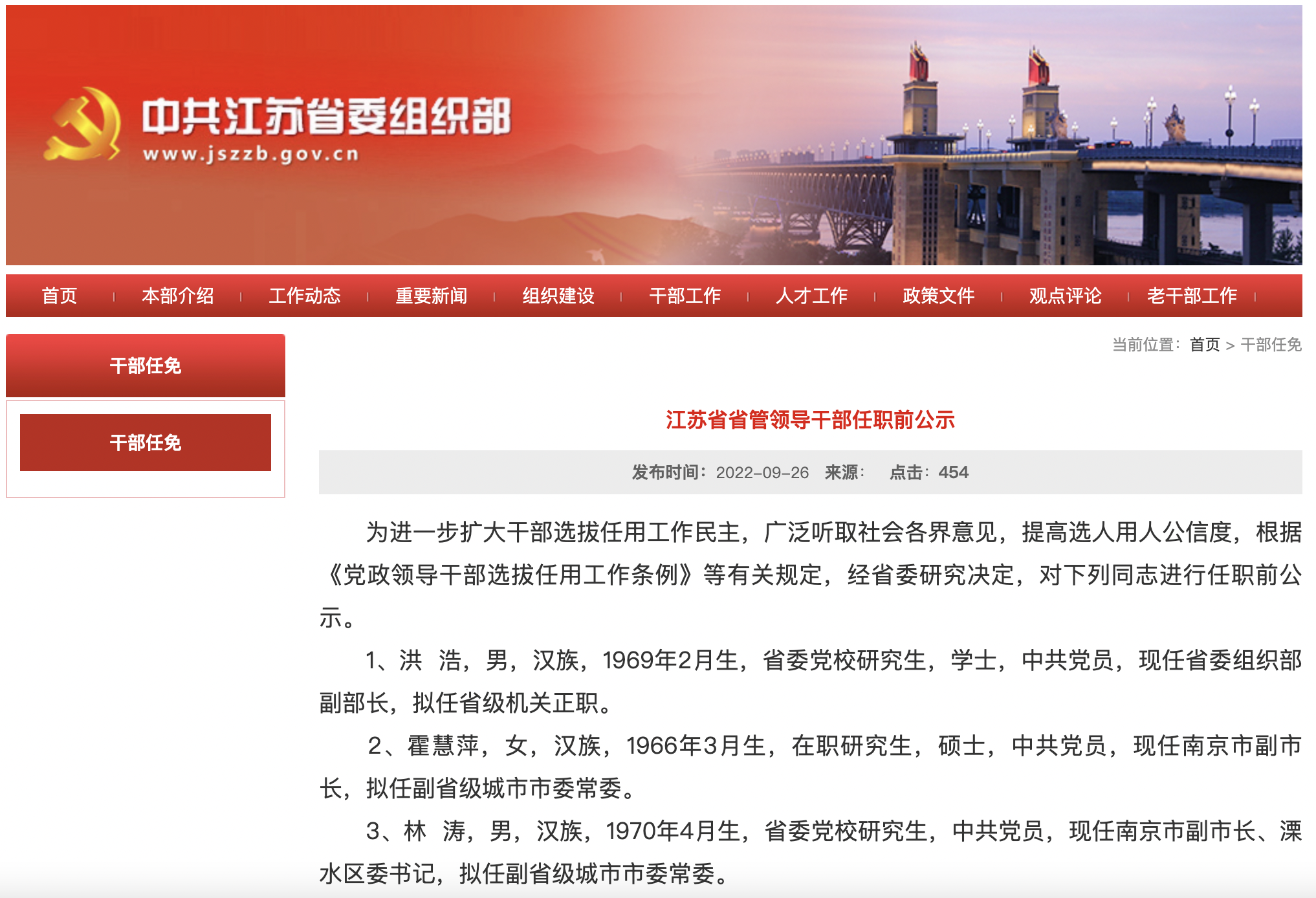 2、霍慧萍,女,汉族,1966年3月生,在职研究生,硕士,中共党员,现任南京市副市长,拟任副省级城市市委常委。