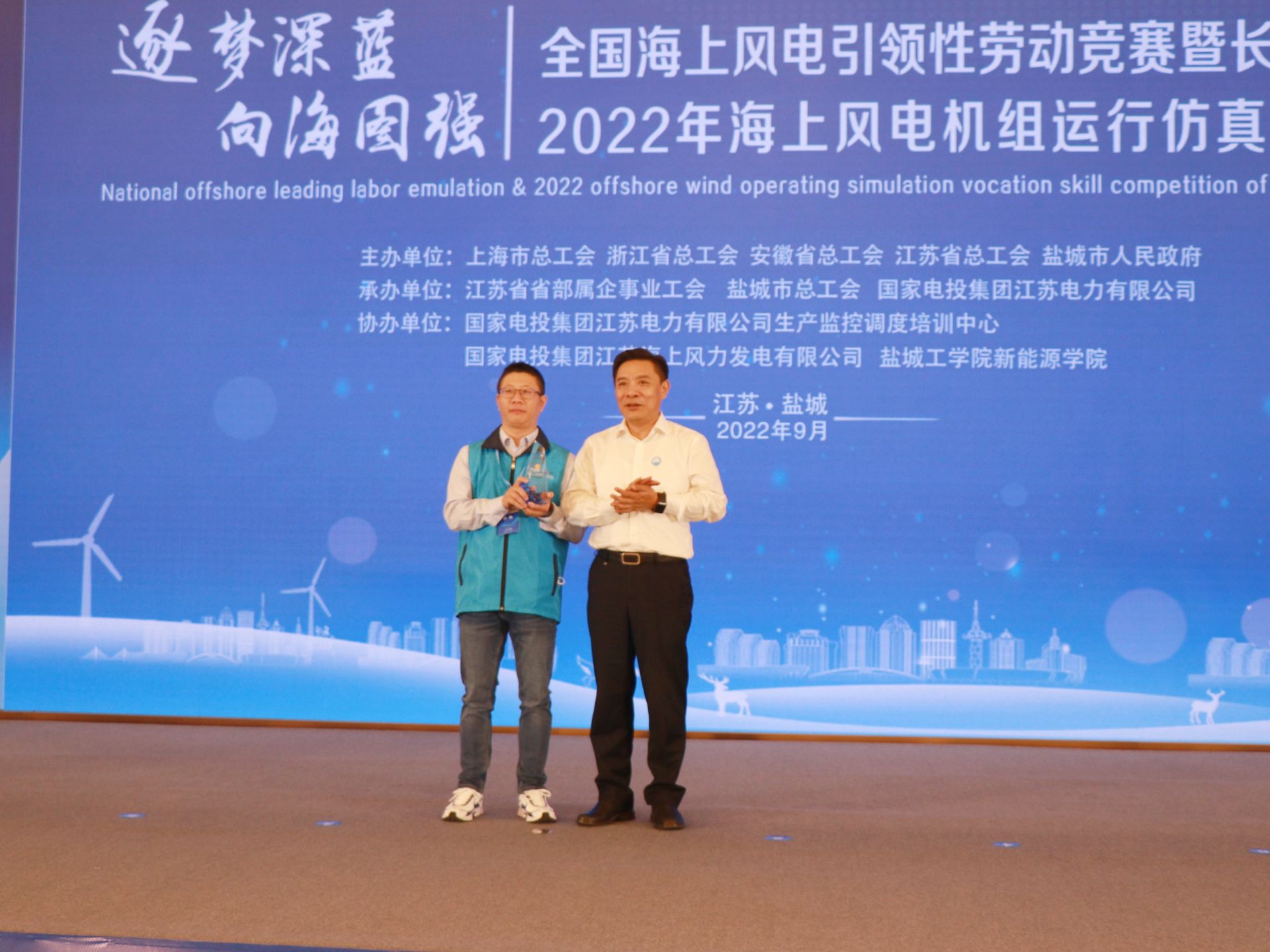 作为承办方之一,盐城市总工会积极做好竞赛场地安排等后勤服务工作,为整个竞赛工作顺利开展创造了良好的条件。市总工会党组书记、常务副主席王玉新在闭幕式致辞时说,在全球低碳经济与能源革命的大趋势下,在“碳中和、碳达峰”的大目标下,海上风电是一个大有作为的行业,需要造就一支有理想守信念、懂技术会创新、敢担当讲奉献的工人队伍。他希望获奖选手要再接再厉,在工作中起好带头作用;广大风电产业职工要立足岗位,勤于操练,不断提高技能水平;各风电企业应切实加强员工培训,为他们提供发展的平台、成长的空间。“我们也将以本次竞赛为契机,总结经验,查找不足,拓宽和深化竞赛功能,巩固和扩大竞赛成果,共同促进风电产业的高质量发展,勇当‘碳路’先锋。”王玉新最后说。