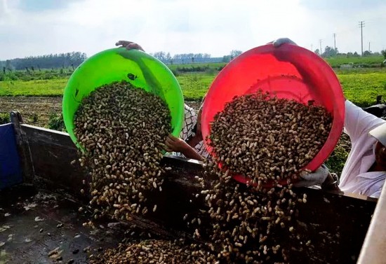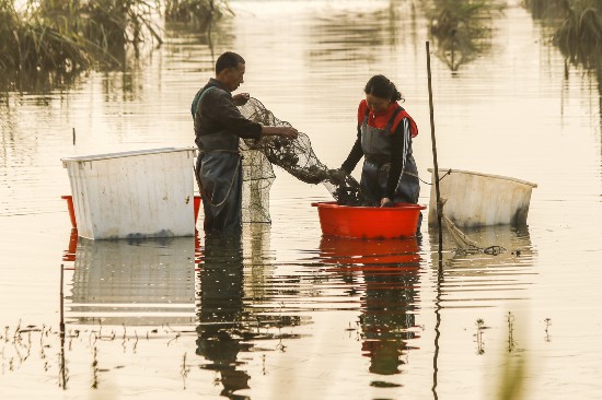 在来安花生喜获丰收时,裴圩镇5000余亩的螃蟹也“爬”上了市民的餐桌,丰富了食客的味蕾。记者在裴圩镇新四村的生态螃蟹养殖基地看到,养殖户张伦和工人们正忙碌着,他们把沉在水中的蟹篓提出水面,吃力地将兜在网里的“蟹将们”逐个倒出。看到一只只青壳锃亮的螃蟹,大伙儿乐得合不拢嘴。