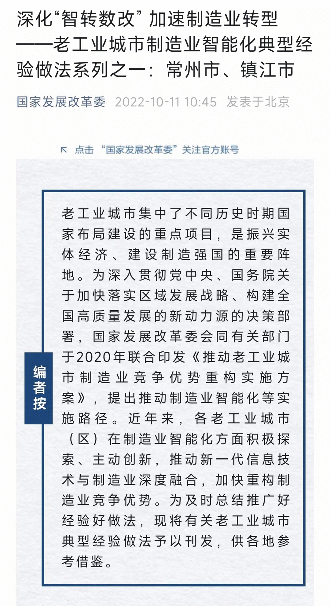 又一“镇江经验”获全国推广。10月11日,国家发展改革委将镇江市老工业城市制造业智能化典型经验做法,予以刊发推广,供各地参考借鉴。