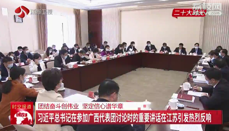 习近平总书记17日上午参加党的二十大广西代表团讨论,深刻阐明党的二十大报告的重要历史意义,在江苏代表中以及江苏广大干部群众中引发热烈反响。大家一致表示,要以习近平总书记重要讲话精神为指引,深刻领悟党的二十大报告的精髓要义,坚定历史自信、增强历史主动、在新的赶考之路上向历史和人民交出新的优异答卷。