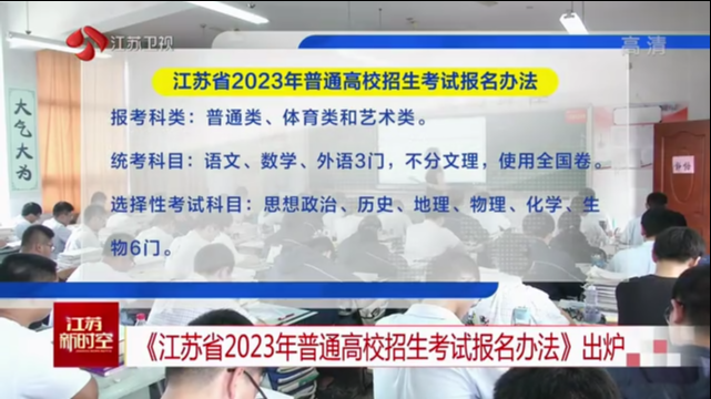 《江苏省2023年普通高校招生考试报名办法》10月18日正式发布:报考科类分为普通类、体育类和艺术类。统考科目为语文、数学、外语3门,不分文理,使用全国卷。选考科目为:思想政治、历史、地理、物理、化学、生物6门。学生先在物理、历史2门科目中选1门,再从思想政治、地理、化学、生物4门科目中选2门,成绩计入总分。参加2023年高职院校提前招生的考生,须取得语文、数学、外语、思想政治、历史、地理、物理、化学、生物、信息技术10门科目的合格性考试成绩。报考艺术类的考生,如需参加专业省统考,还须选择报名参加相应科目的专业加试。