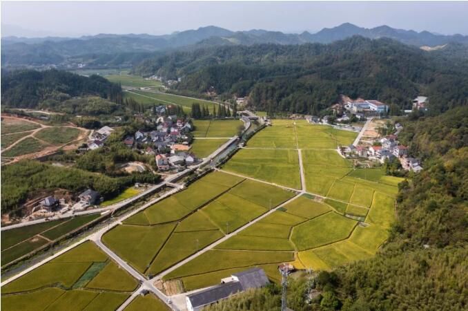 空中俯瞰杭州市临安区太阳镇太阳米稻田基地。图源:新华社