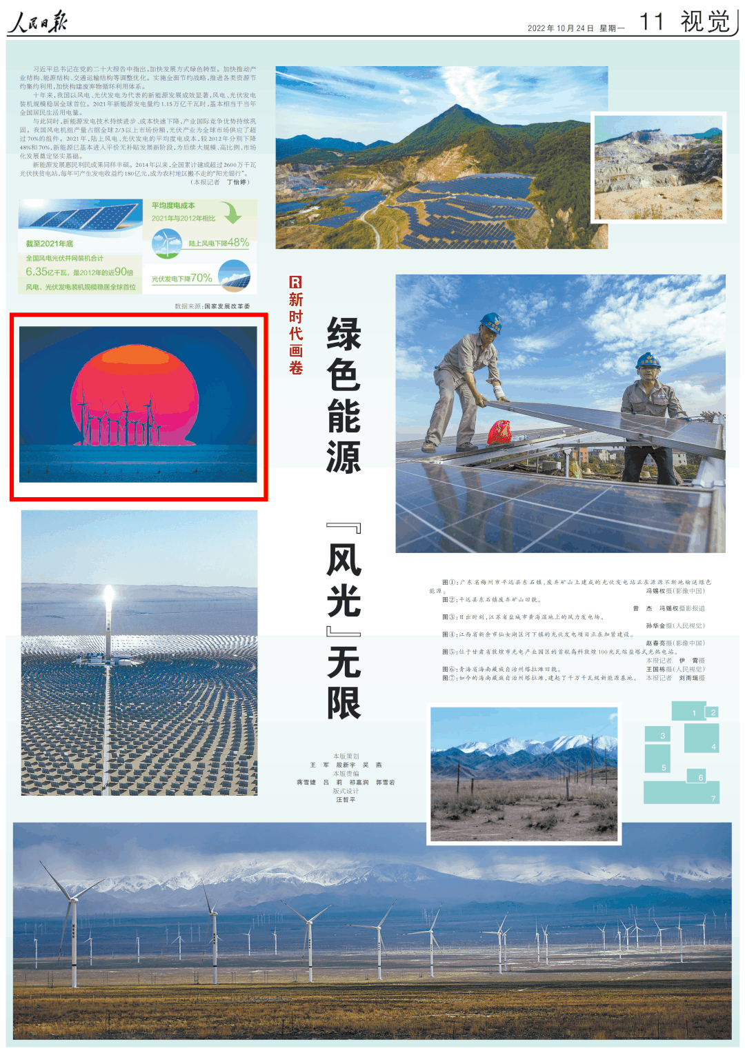 10月24日的《人民日报》以《绿色能源 “风光”无限》为题,报道了十年来我国以风电、光伏发电为代表的新能源发展成效显著,风电、光伏发电装机规模稳居全球首位。