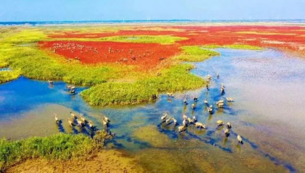 湿地五彩斑斓,国家一级保护动物野生麋鹿种群在蓝天碧水间栖息觅食,嬉戏奔跑。