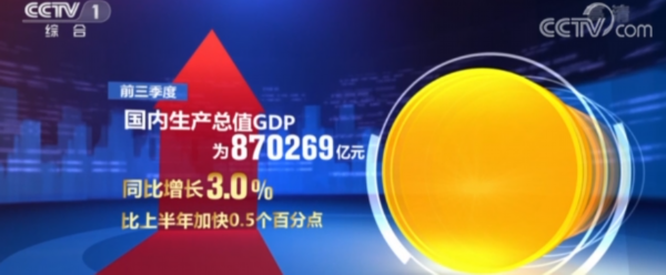 前三季度,国内生产总值GDP为870269亿元,同比增长3.0%,比上半年加快0.5个百分点,经济总体呈现恢复向好态势。其中,三季度当季GDP同比增长3.9%,比二季度加快3.5个百分点。