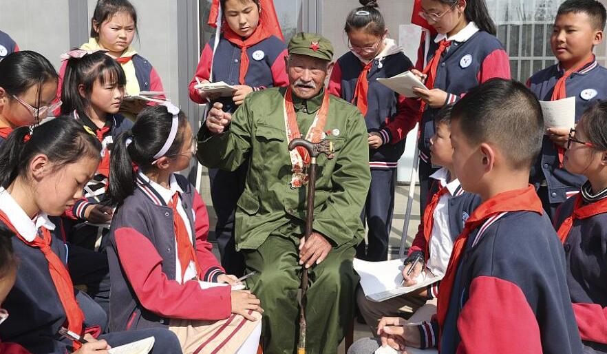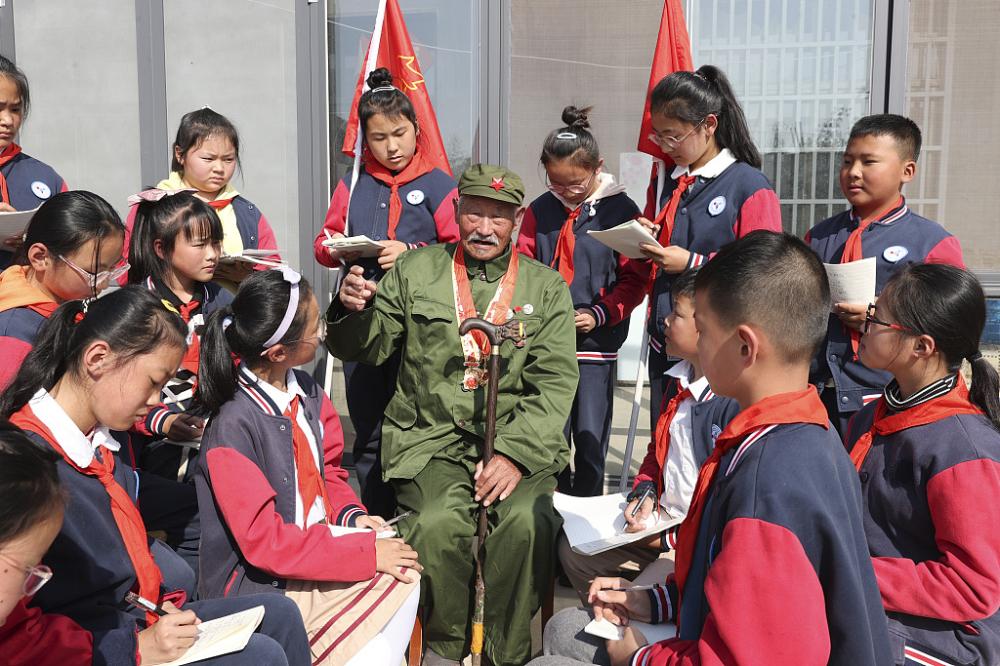 2022年10月24日,江苏省连云港市,马站中心小学的学生们聆听95岁志愿军老英雄包胜堂讲抗美援朝战斗故事。当日,江苏省连云港市马站中心小学开展“致敬抗美援朝,争做时代新人”主题团日活动。深入学习志愿军的英雄事迹和革命精神,争当新时代好少年。据悉,2022年10月25日是中国人民志愿军抗美援朝72周年纪念日。