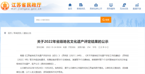 今年年初,江苏省民政厅、省文化和旅游厅等6部门印发《江苏省地名文化遗产评定办法(试行)》(以下简称《评定办法》),推动全省各级建立健全地名文化遗产保护名录制度,大力加强新时期地名文化遗产保护工作。