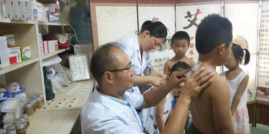 乡村医生翟大龙在河北省大名县西未庄乡中未城村卫生室里为村中儿童贴敷膏药。受访者供图