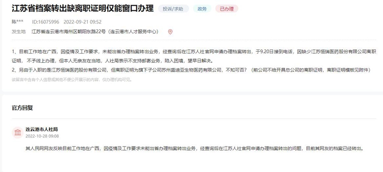 参加广西公考“上岸”的陈先生今年6月向原工作单位提出辞职,调档时因为离职证明问题卡了壳。近段时间他人在广西,受疫情影响不便前往江苏连云港办理,但该市人才服务中心不接受文件快递,遂向人民网“领导留言板”做了反映。连云港市人社局日前回复称,该网友的档案目前已经转出。