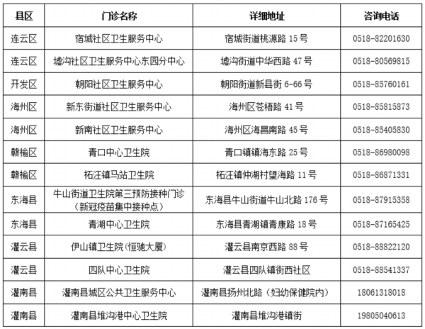 连云港市吸入式新冠病毒疫苗接种门诊一览表