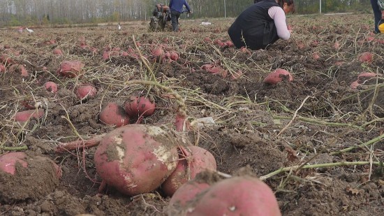 国家甘薯产业技术体系首席科学家:李强:我们大家知道今年一个是高温、一个是干旱,在这样的条件下,我们的甘薯还取得了这样一个高的产量。我们刚刚进行了一个测产,鲜薯产量几个点很平均,亩产量都在11500斤左右,在大旱之年能够取得这样好的成绩,是可喜可贺的。