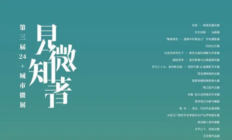 2020年,以“文艺赋能城市,文艺融入生活”为主旨的第一届“见微知著——24+城市微展”,用24个微展厅绘制成独具金陵韵味的“南京文艺地图”,让市民可以沿着文艺地图的线路,在街头巷尾打卡各式各样的城市微展厅,在日常生活中与文艺相遇。2021年,以“文艺赋能城市,文艺赋能乡村”为主旨的第二届“见微知著——24+城市微展”从水木秦淮艺术街区出发,在银杏里文化街区、小西湖街区、德基广场、陶谷新村、梅园新村、浦口响堂、大桥南堡等片区,筛选出具有代表性、各具特色的微展厅,形成第二届城市微展的“南京文艺地图”。