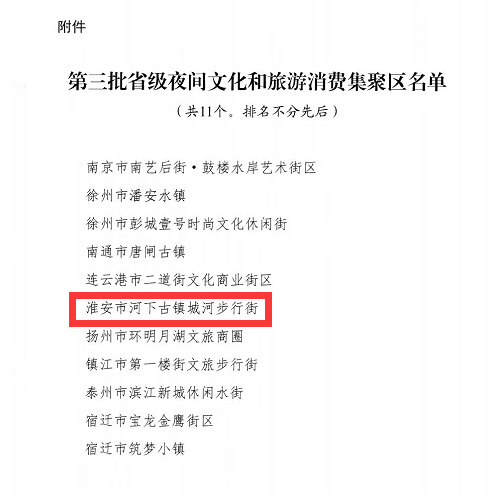 11月21日,省文旅厅公布了第三批省级夜间文化和旅游消费集聚区名单,淮安市河下古镇城河步行街成功入选,这也是继清江浦景区、御码头运河文化旅游中心之后,今年以来我市创成的第3个省级夜间文旅消费集聚区。