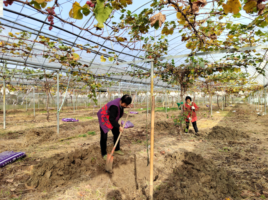 挖渠栽植、施有机肥、深翻松土……初冬时节,江苏省淮安市清江浦区武墩街道武墩村兴农果树专业合作社的葡萄园里一派繁忙的劳作景象,负责人张强和工作人员穿梭在大棚内,忙着为来年葡萄丰收打基础。