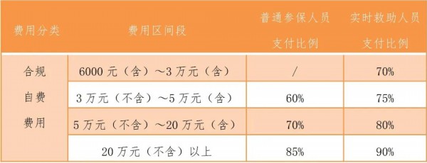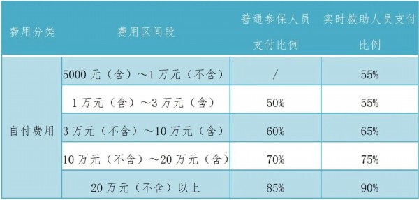 (3)实时救助人员大病保险年度累计自付费用起付标准为5000元,合规自费费用起付标准为6000元;各费用段支付比例在普通人员支付比例的基础上向实时救助人员倾斜。